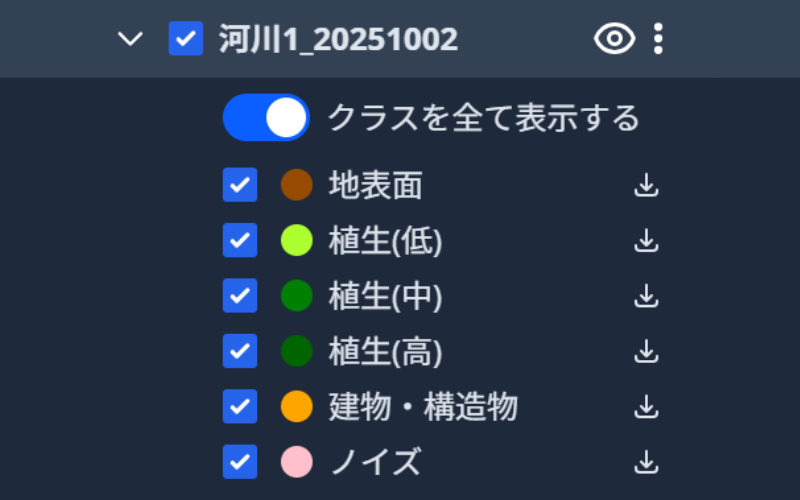 ブラウザから点群データをScanXにアップロードするだけ。AIがノイズ・地表面・植生・構造物を自動で判別・分類します。特に地表面の分類精度は約95%と高く、仕分け作業の時間を約5分の1に短縮できます。