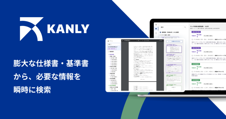 Kanlyは、土木業界の仕様書・基準書などを一括検索できる検索エンジンです。共通仕様書・出来形管理基準・写真管理基準など、仕様書を読まなければいけない全ての方のために開発されており、業務効率を飛躍的に向上させます。