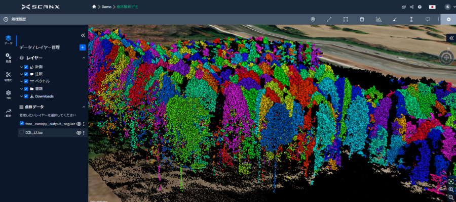 - ドローンなど空撮によるLiDAR測量や写真測量で取得した森林の点群データをScanXにアップロードし、 樹木解析ボタンを押すだけで、 樹木1本ずつ抽出したデータを自動出力。