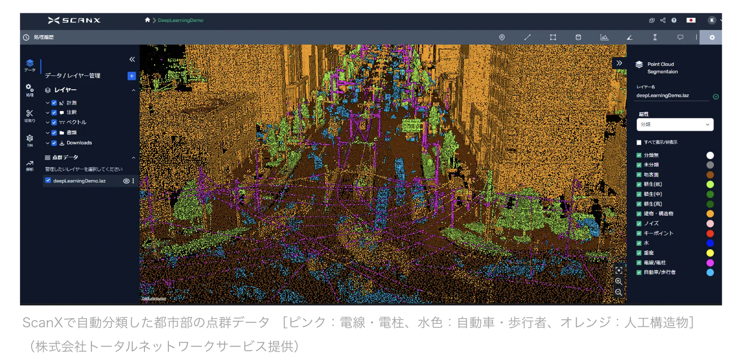 ScanXはこれまで高度な3D点群処理技術を用いて分類を行っていました。 新たに深層学習を用いた高度な分類機能も加わり、 電線や電柱、 自動車や歩行者も分類出来るようになりました。 今後も引き続き、 ユーザーの皆様からのご要望に応じて開発を続け、 順次さまざまな機能を実装し、 進化させてまいります。