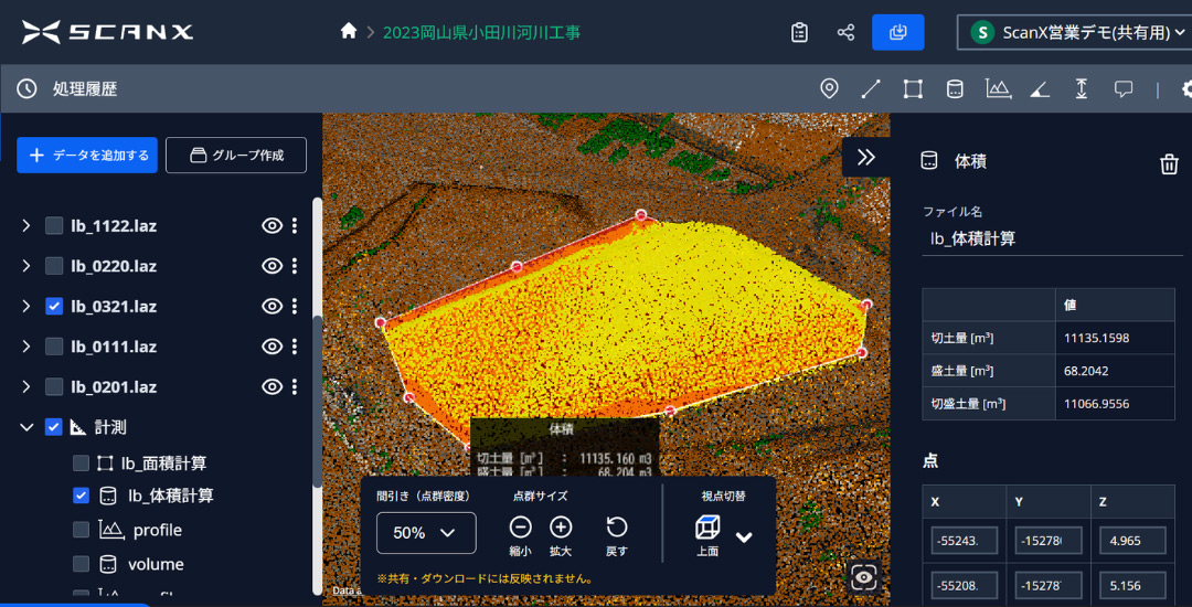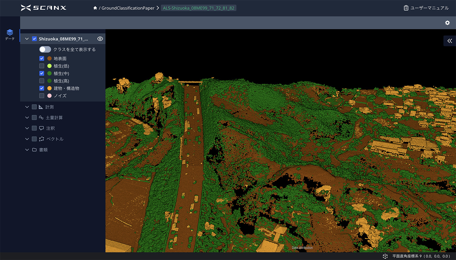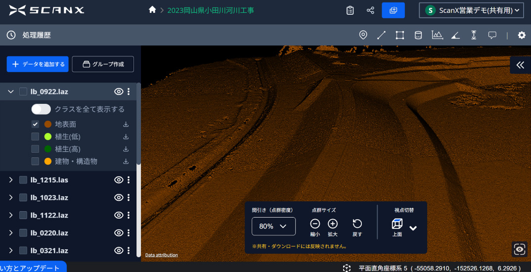 ScanX(スキャン・エックス)は、ScanXは大容量の点群データを自動で綺麗にするオンライン点群処理ソフトウェアです。 高額なライセンスや高性能PCは不要で、ブラウザだけで複数人が同じデータを同時に扱えます。
